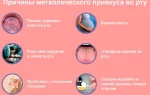 - Причинами возникновения кисло-металлического вкуса могут быть стоматологические манипуляции такие, как установка мостов, протезов, пломб. Появление такого вкуса может спровоцировать кровоточивость десен, гингивит, альвеолит, внутренние кровотечения.